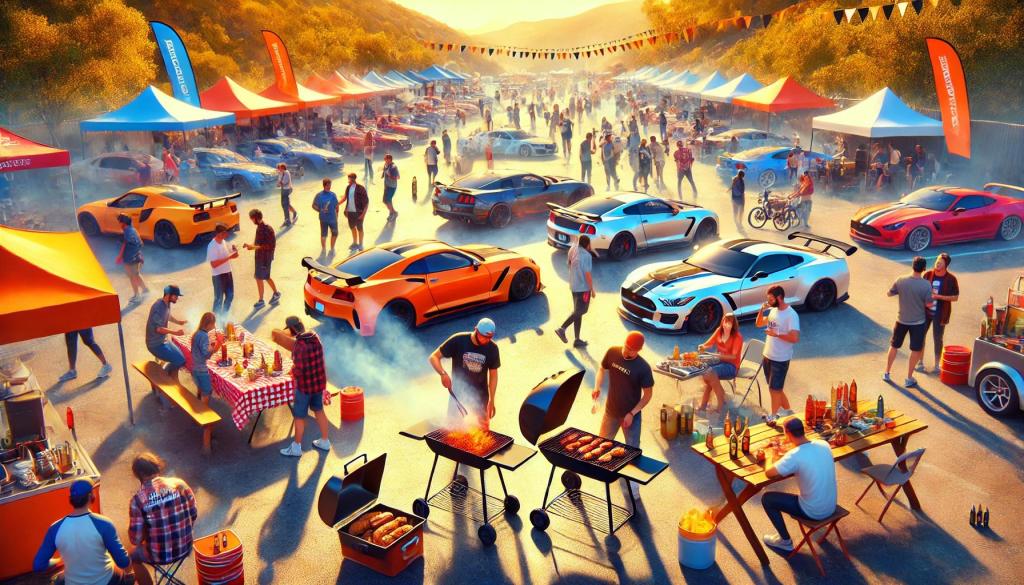Here is a vibrant image depicting a group of people enjoying a barbecue with high-performance cars in the background by 91 Media.