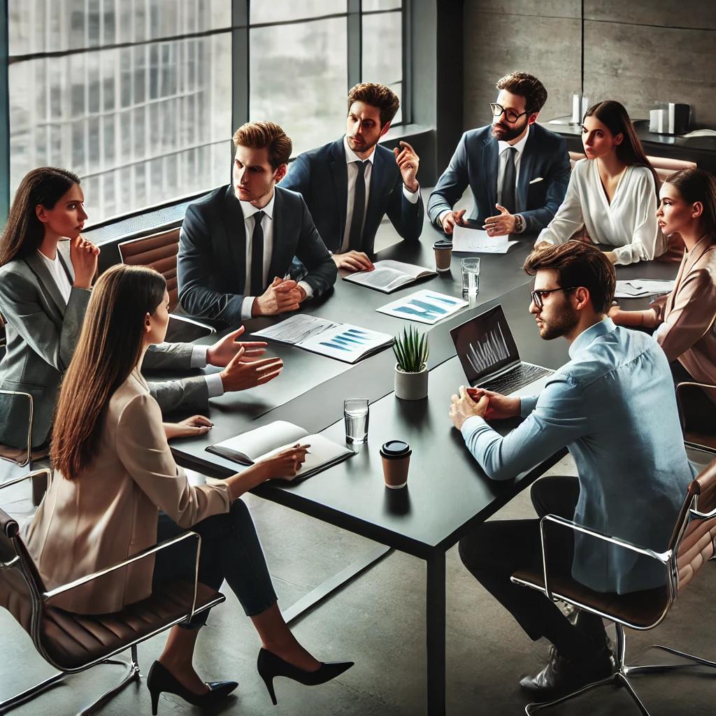 Here is the generated image of a group of people engaged in negotiation by DALL·E
